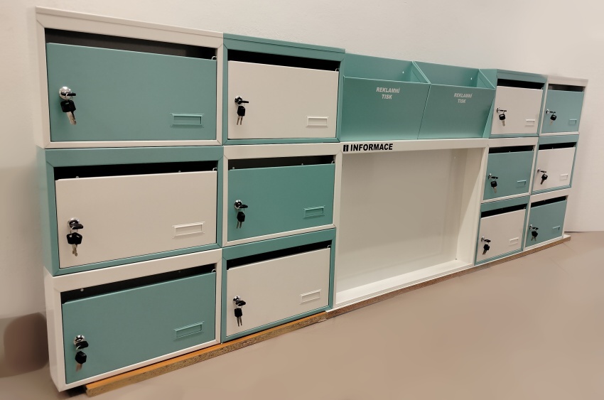 - Sestava 12 bytových schránek, nástěnka, 2x boxy na letáky